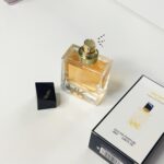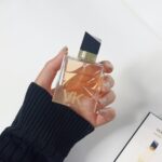 - طراحی ارگونومیک و لوکس: بطری این عطر با الهام از طراحیهای نامتقارن و مدرن ساخته شده است. بدنه شیشهای شفاف در کنار درب مشکی زاویهدار و طوق طلایی، آن را به یک اکسسوری شیک تبدیل کرده است.